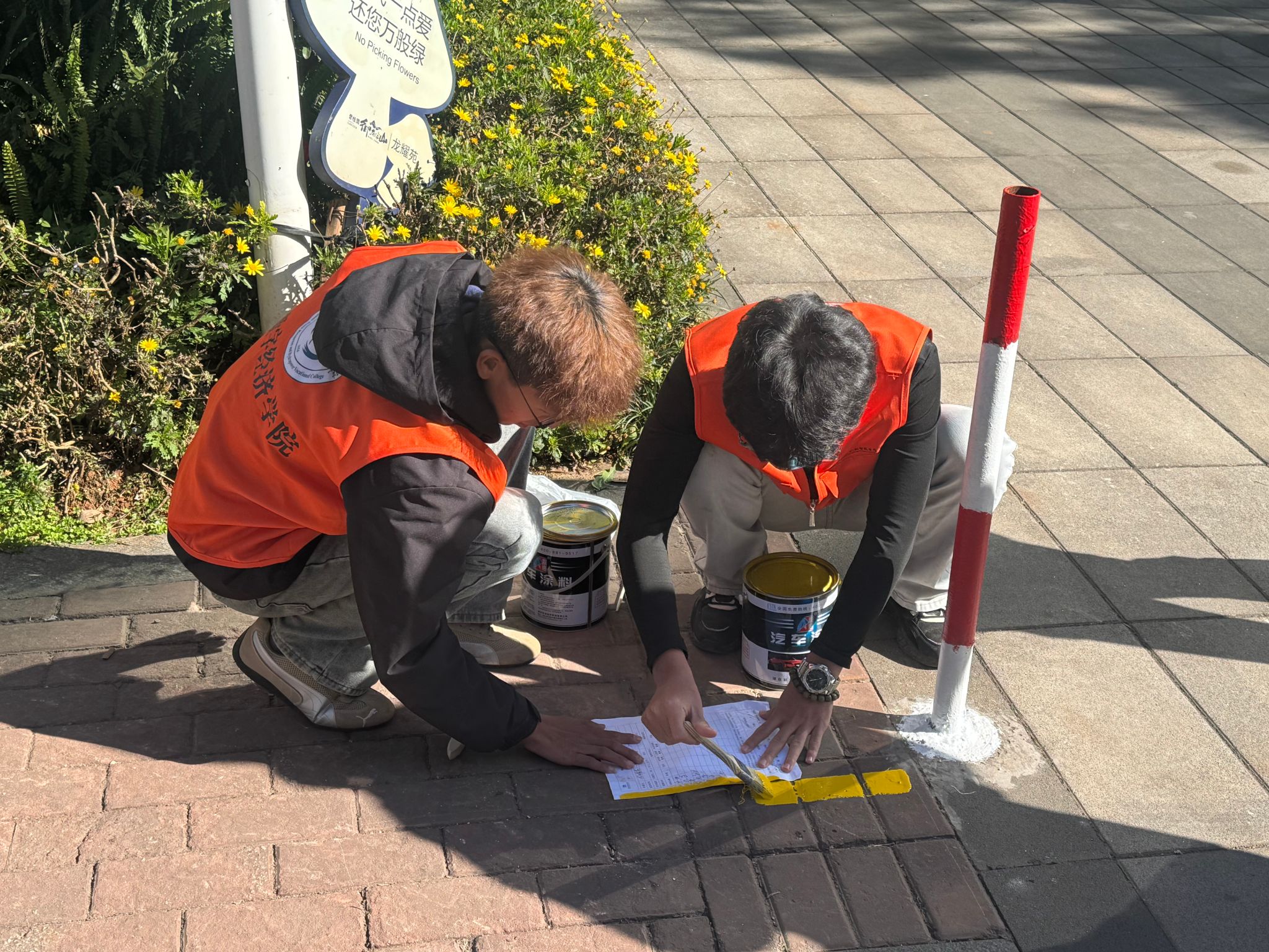 活动当日,在学院带队老师李艳的率领下,6名师生志愿者抵达社区。社区负责人对学院的支持表示感谢,并强调了活动对于提升社区人居环境与文化氛围的重要意义。随后,志愿者们分组协作,手持画笔与彩漆,在寒风中精心绘制。通过勾勒线条、填充色彩,原本朴素的路面逐渐转变为兼具美感与指引功能的文明图案,展现了学院师生良好的艺术创造力与实践动手能力。