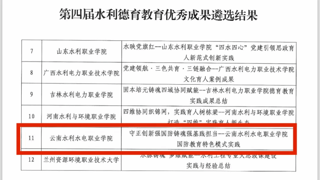 近日,中国水利教育协会公布了第四届水利德育教育优秀成果遴选结果。我校“守正创新强国防 铸魂强基践担当——云南水利水电职业学院国防教育特色模式实践”荣获三等奖。