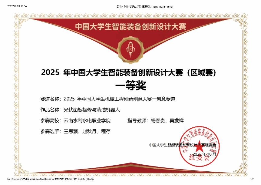 我校王思颖团队自主研发的“光伏面板检修与清洁机器人”凭借创新结构与场景化解决方案,在智能装备创新设计大赛西南区域赛中,从百余支高校队伍中脱颖而出,斩获一等奖,锁定全国总决赛入场券。