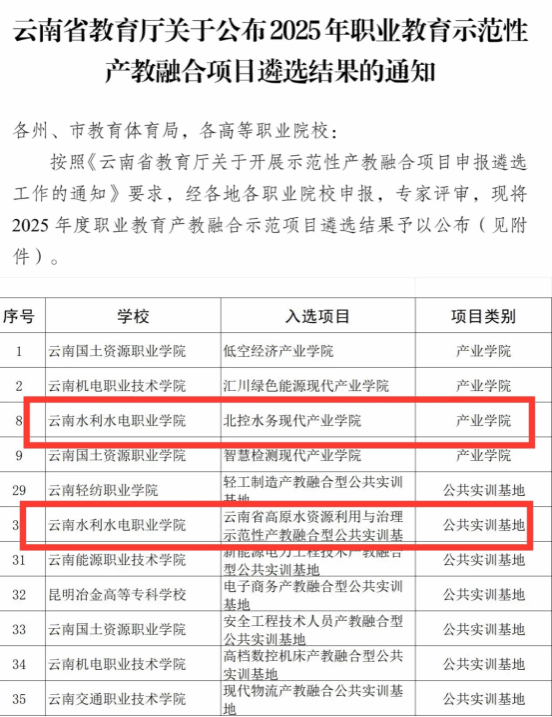 近日,云南省教育厅正式公布2025年度职业教育示范性产教融合项目遴选结果,我校“北控水务现代产业学院”(产业学院类别)和“云南省高原水资源利用与治理示范性产教融合型公共实训基地”(公共实训基地类别)成功入选。